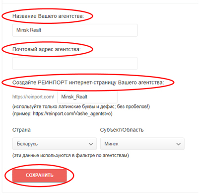 3. В поле "Название Вашего агентства" пропишите название Вашего будущего виртуального агентства; в поле "Создайте РЕИНПОРТ интернет-страницу Вашего агентства" пропишите латинскими буквами название Вашего будущего виртуального агентства, что и станет Вашим интернет-адресом; Вы также можете загрузить файл лицензии (свидетельство о государственной регистрации физического лица в качестве индивидуального предпринимателя/юридического лица (ООО) Вашего будущего виртуального агентства.