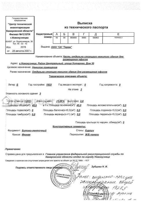 Продажа части отдельно стоящего нежилого здания для размещения офисов площадью 45 м2, расположенной на этаже № 3 по адресу: Кемеровская область, г. Новокузнецк, Центральный район, ул. Хитарова, д. 30, кадастровый номер: 42:30:0101001:14966.