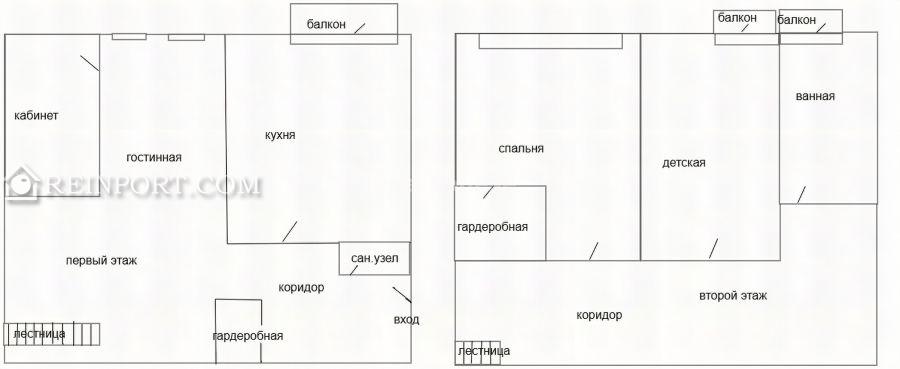 Планировка: 1- ый этажа: прихожая и гардеробная, ванная, кухня, гостинная, спальня, 2 - ой этаж - две комнаты, ванная комната, два балкона.