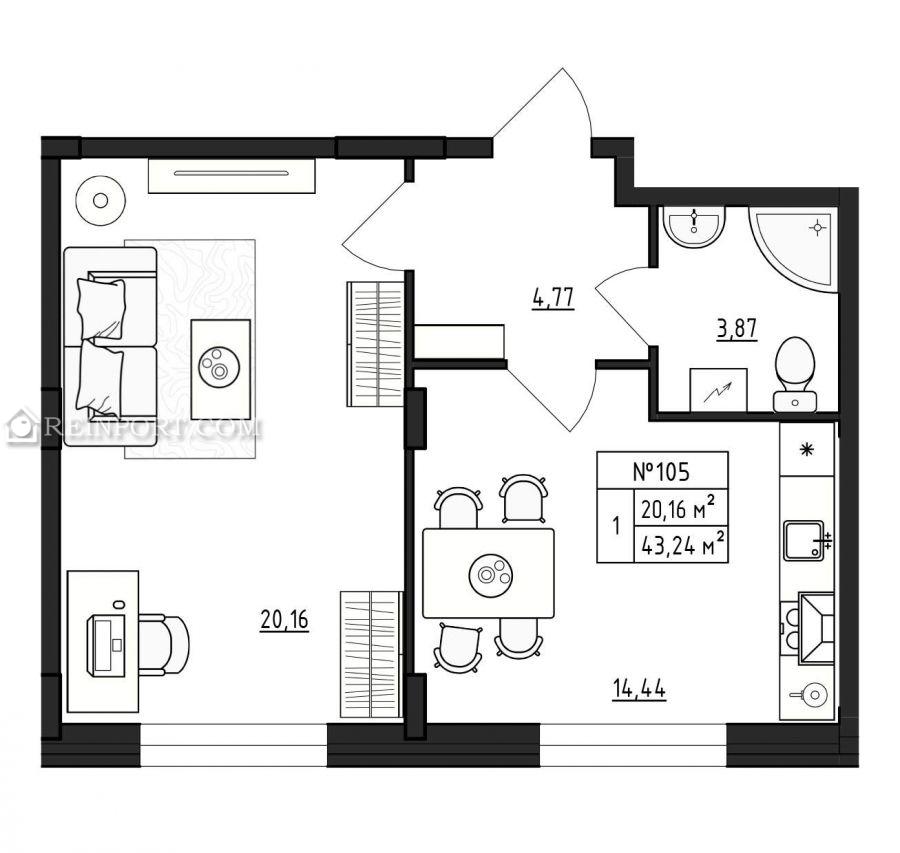Жилая площадь 20.16 м2, кухня 14.44 м2, комнаты изолированные.