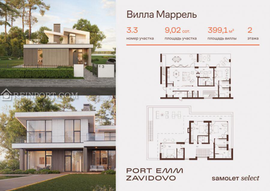 В продаже вилла площадью 399,1 м2 на участке 9,31 соток от застройщика «Самолет» в загородном проекте PORT EMM ZAVIDOVO.